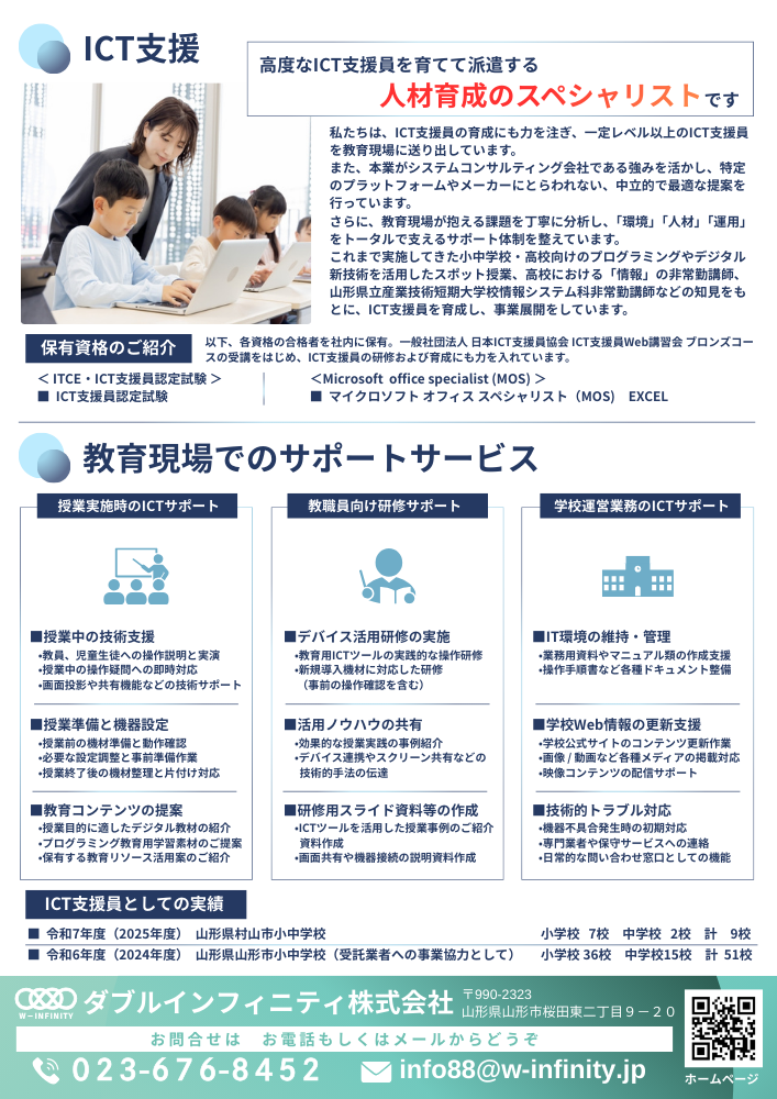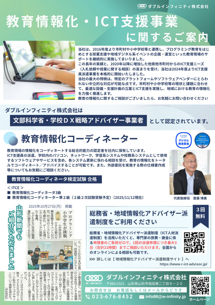 これまで実施してきた小中学校・高校向けのプログラミングやデジタル新技術を活用したスポット授業、高校における「情報」の非常勤講師、山形県立産業技術短期大学校情報システム科非常勤講師などの知見をもとに、ICT支援員を育成し、事業展開をしています。